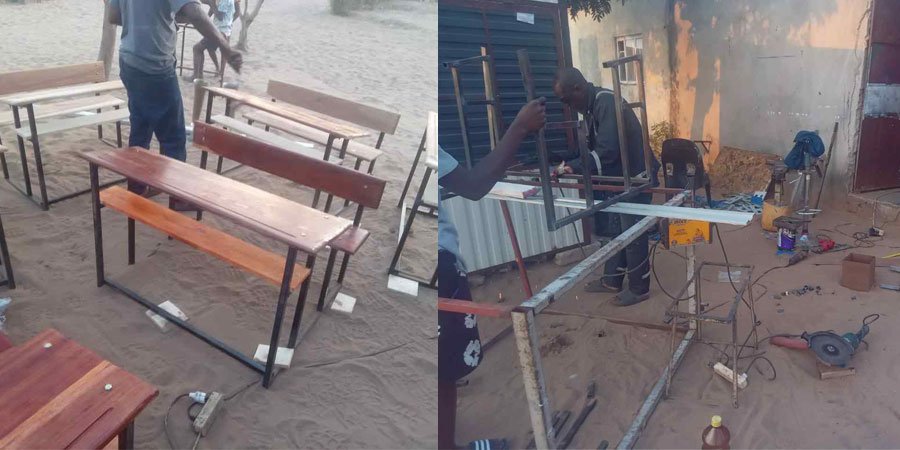 사진: 대조 제일 초등학교와 소망 중·고등학교 학생들의 의자를 주문 받아 제작하고 있는 모습